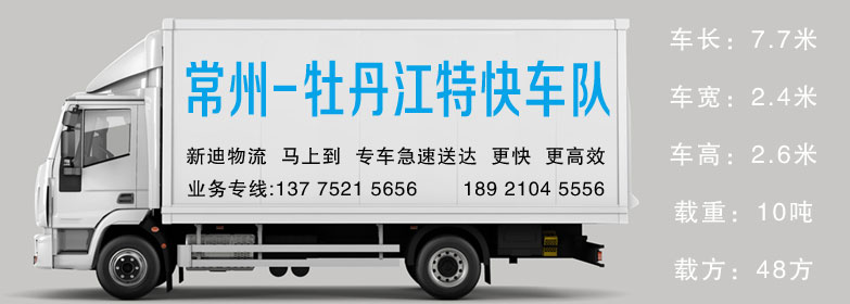 | 常州到牡丹江貨車:7.7米長×2.4米寬×2.6米高 | 常州到牡丹江7.7米貨車載重:10T /方數(shù):≈48方 | 常州到牡丹江專車運(yùn)輸業(yè)務(wù):13775215656 |